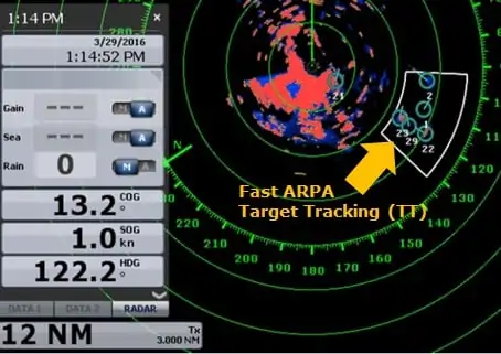 Le Fast Target Tracking suit automatiquement plus de 100 cibles jusqu’à 3 NM. Chaque cible possède un vecteur cap et vitesse. Une alarme TCPA peut s’activer pour la prévention des collisions.